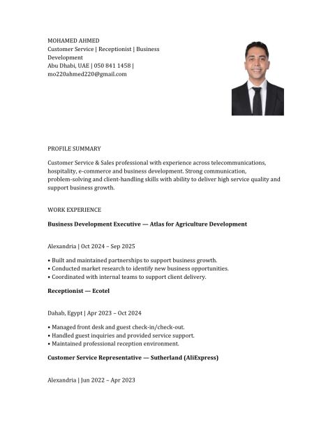 اسمي محمد أحمد، عمري 27 عاما، خريج كلية اللغات والترجمة - قسم اللغة الانجليزية. لدي خبرة في المبيعات وخدمة العملاء والاستقبال وتطوير الأعمال، وأجيد استخدام الكمبيوتر وبناء علاقات قوية مع العملاء. أنا شخص متحفز، ملتزم، ومركز، وابحث عن فرصة عمل تناسب مهاراتي وقدراتي. أحمل تأشيرة زيارة، وأقيم حاليا في أبوظبي، ويمكنني الانتقال الى أي مكان عند الحاجة