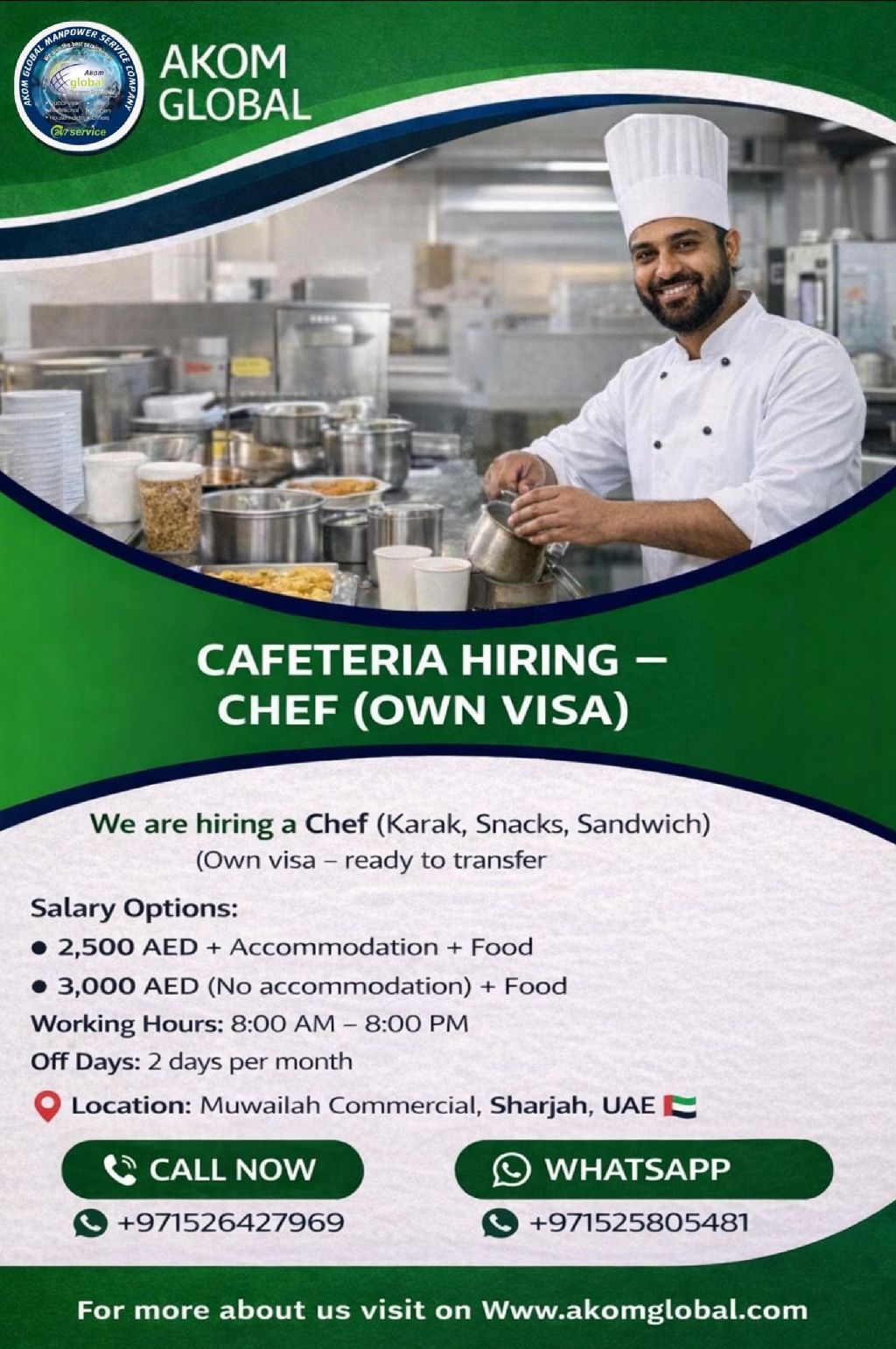 WE ARE HIRING FOR Cafeteria STAFF WITH Own Visa Ready TO TRANSFER CHEF FOR (KARAK - SNACKS - SANDWICH) Salary 2500. AED With Accommodation AND FOOD PROVIDED OR Salary 3000. AED NO Accommodation FOOD PROVIDED Duity from 8 am to 8 pm 2 days off per month Location muwilah commercial, Sharjah For more about us visit