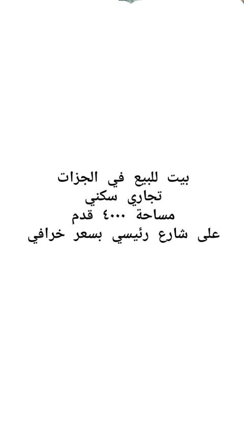 بيت شعبي في الجزات تجاري سكني، مساحة 4000 قدم على الشارع الرئيسي المنزل مكون من (4 غرف + 4 حمام + صالة + حوش + موقف سيارات داخل وخارج المنزل. مؤجر ب 50 ألف