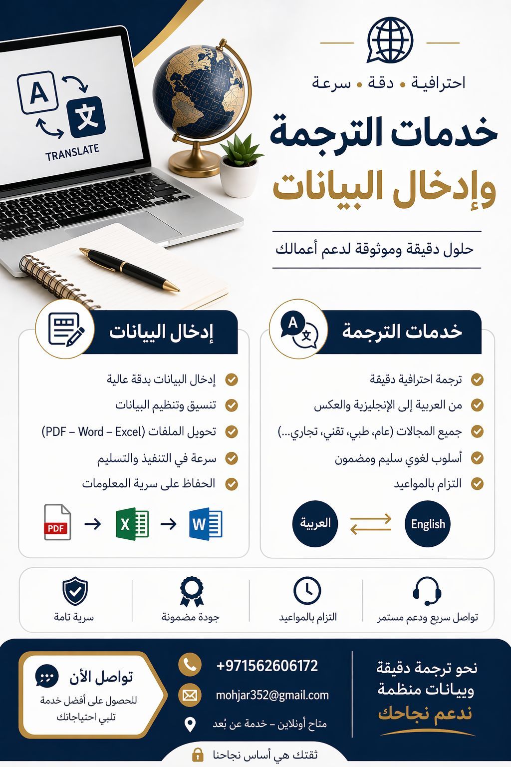 خدمات ترجمة وادخال بيانات باحترافية هل تبحث عن شخص موثوق لانجاز أعمالك بسرعة ودقة أنا أقدم لك خدمات مميزة تشمل الترجمة ترجمة عربي انجليزي بدقة واحتراف ترجمة مقالات، رسائل، مستندات، وسير ذاتية ادخال البيانات ادخال بيانات بسرعة عالية وبدون أخطاء تنظيم ملفات Excel وWord تحويل ملفات PDF الى Word أو Excel التزام بالمواعيد أسعار مناسبة جودة عالية للتواصل والاستفسار، راسلني