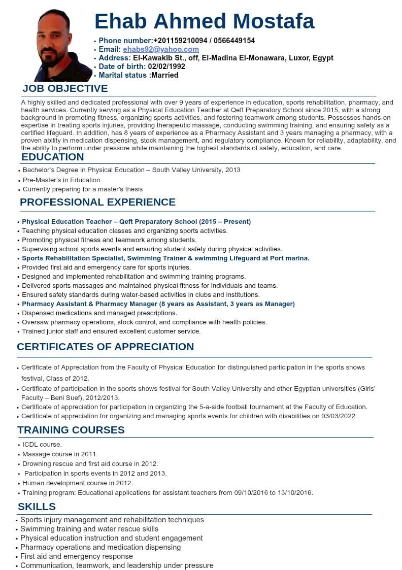 معلم تربية بدنية بوزارة التربية والتعليم في مصر خبرة عشرة سنوات حاصل على تمهيدي ماجستير وحاصل على دورة اتقاذ من الاتحاد المصري للغوص والسباحة وعملت كمنقذ في برتو مارينا لمدة عام حاصل على دورة اصابات ملاعب ودورة تدليك واعداد القادة وعملت كمدرس عروض رياضيه بالادارة التعليمة سبع سنوات وعملت مدرب كرة قدم لأكاديمية المستقبل لمدة عام