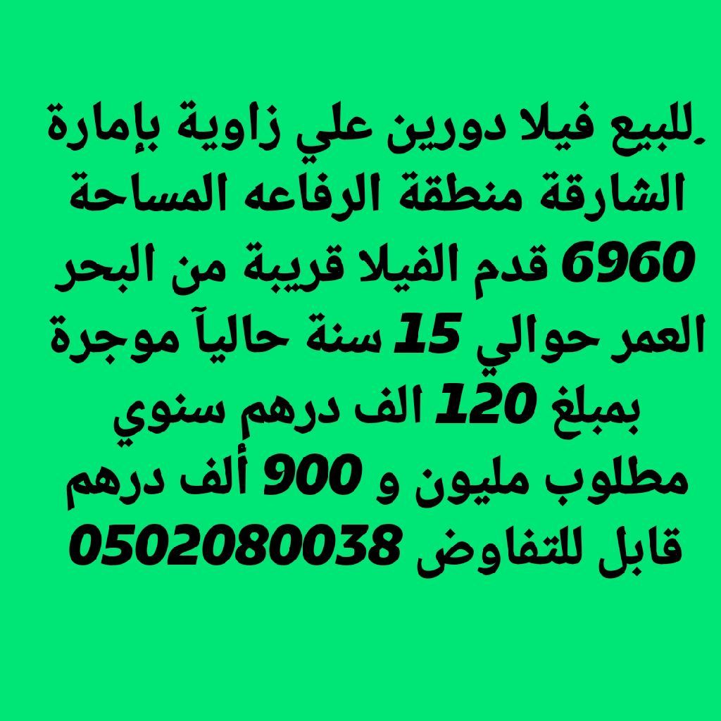 للبيع فيلا دورين علي زاوية في إمارة الشارقة منطقة الرفاعة المساحة 6960 قدم الفيلا قريبة من البحر العمر حوالي 15 سنة حاليا مؤجرة بمبلغ 120 ألف درهم سنوي مطلوب مليون و900 ألف درهم قابل للتفاوض