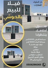 فيلا فاخرة للبيع في الحوشي - موقع مميز الموقع مقابل قصور الشيوخ - شارع عرض 24 متر قريب من المدارس والخدمات الأساسية سهولة الوصول للطريق العام والمناطق الحيوية منطقة هادئة وآمنة للعائلات المواصفات مساحة الأرض 6000 قدم مساحة البناء 5000 قدم 5 غرف نوم ماستر صالة واسعة + مجلس راقي غرفة خادمة مستقلة تشطيب ديلوكس فاخر