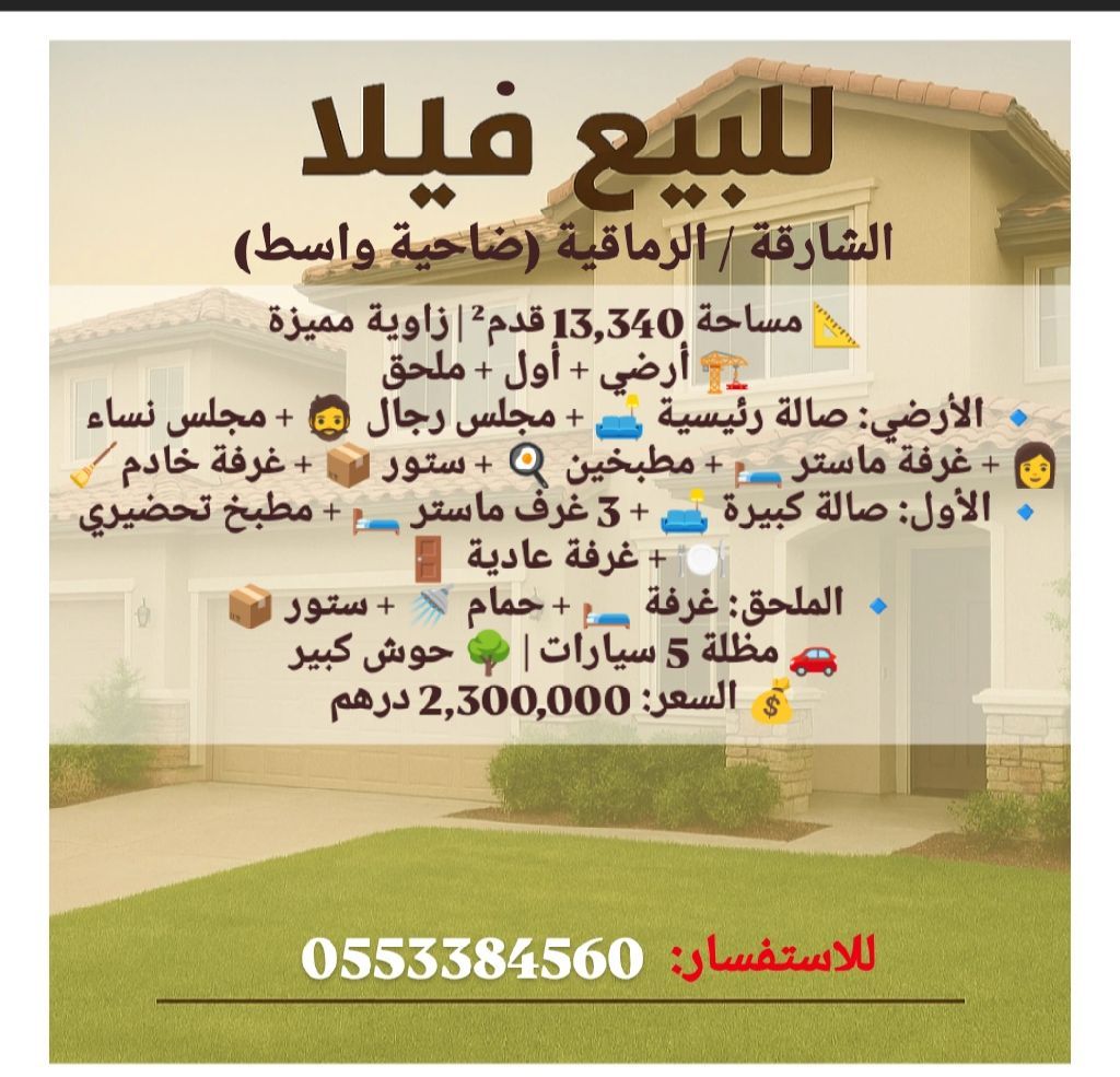 فيلا للبيع - الشارقة / الرماقية (ضاحية واسط) مساحة 13340 قدم زاوية مميزة أرضي + أول + ملحق الأرضي صالة رئيسية + مجلس رجال + مجلس نساء + غرفة ماستر + مطبخين + ستور + غرفة خادمة الأول صالة كبيرة + 3 غرف ماستر + مطبخ تحضيري + غرفة عادية الملحق غرفة + حمام + ستور مظلة 5 سيارات حوش كبير السعر 2300000 درهم