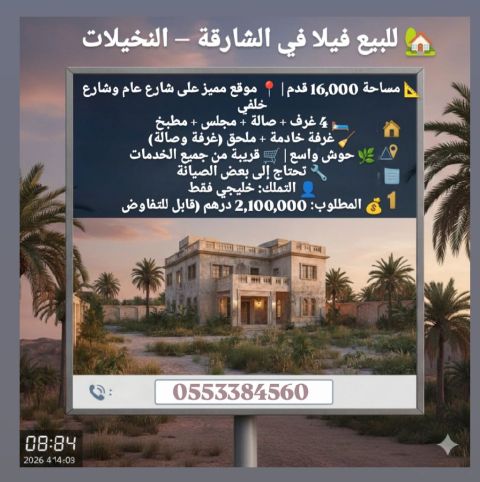 للبيع فيلا في الشارقة - النخيلات مساحة 16000 قدم موقع مميز على شارع عام وشارع خلفي 4 غرف + صالة + مجلس + مطبخ غرفة خادمة + ملحق (غرفة وصالة) حوش واسع قريبة من جميع الخدمات تحتاج الى بعض الصيانة التملك خليجي فقط المطلوب 2100000 درهم (قابل للتفاوض