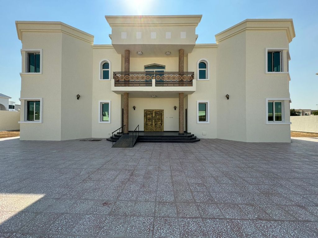 Villa for sale in Sharjah, Al Rahmaniya area. The Villa has two floors. The ground floor has a men'and women'living room, a large master bedroom, and a maid's room. A large indoor kitchen. The upper floor has four master bedrooms. A large courtyard with a parking shed. The Villa has an area of