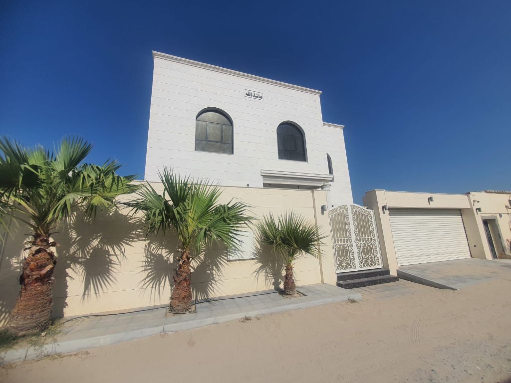 Villa for sale in Sharjah, Umm Khanoor area Land area 2800 square feet, built - up area 2475 square feet, with parking, a canopy, and an electric door for two cars. Ground floor Living room, kitchen, guest lounge with internal and external doors, 2 bathrooms and sinks, laundry room, and storage room. First floor 3 bedrooms, 2 bathrooms, Jacuzzi, living room. Price AED1450000