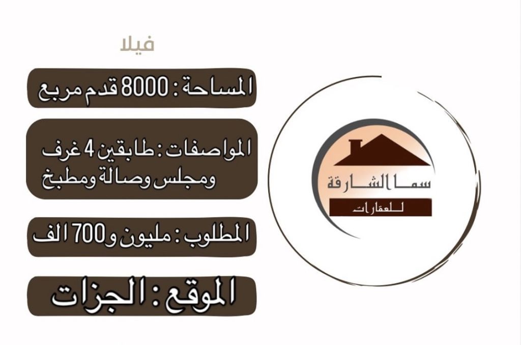 للبيع فيلا طابقين منطقة الجزات ضاحية الرقة تكييف سبليت المساحة 8000 قدم 4 غرف ومجلس كبير وصالة ومطبخ وستور ملحق / مطبخ وغرفة عاملة ملحق / مجلس وغرفة ماستر ومطبخ مطلوب مليون و700 ألف