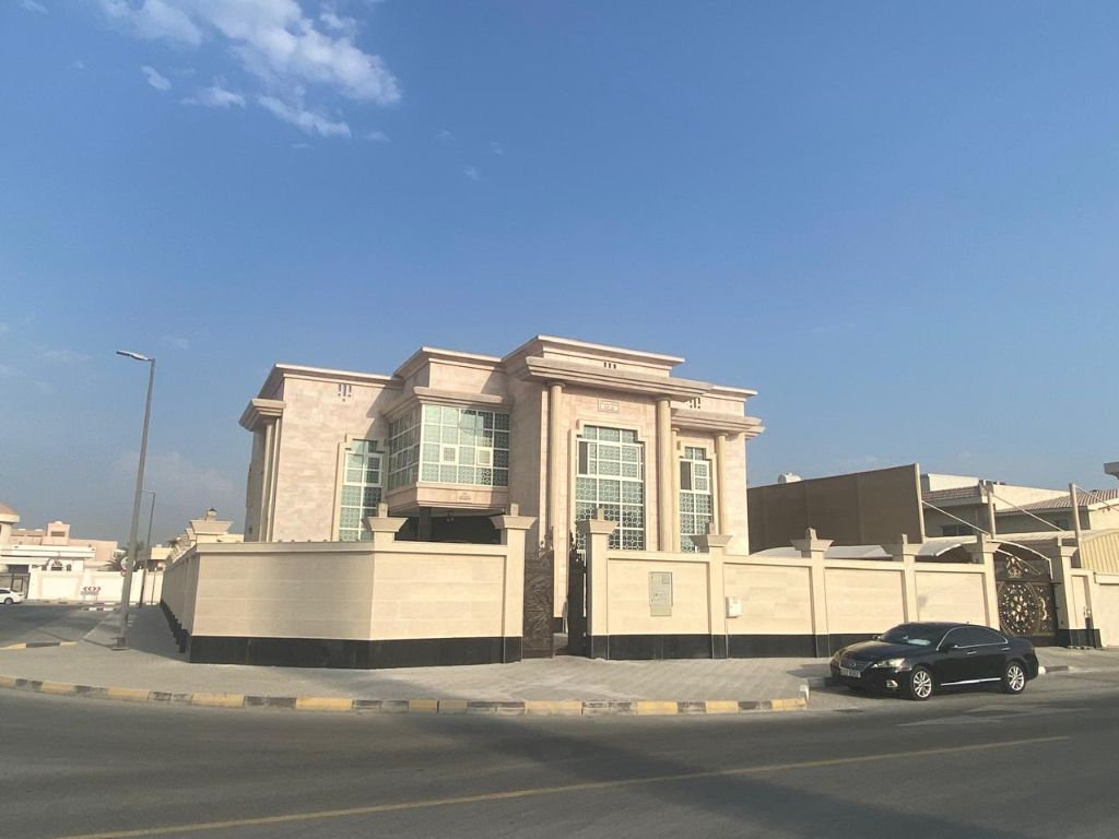 Villa for sale in Al Tarfa area, Sharjah Villa area 18000 SqFt The Villa boasts a prime corner location on three streets and is close to a mosque. The two - story villa features 6 bedrooms, 2 Majlis (formal sitting rooms) 2 living rooms, 2 kitchens, a maid's room, a storage room, a laundry room, and 8 bathrooms. Brand new, never lived in. New air conditioners, kitchens with built - in wardrobes. Asking