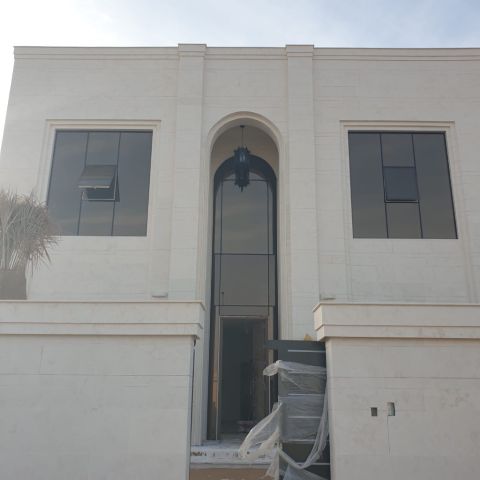 Corner villa for sale, super deluxe finishing, in Al Hooshi, Al Badi'a suburb, Sharjah. Land area 10000 SqFt Built - up area 7400 SqFt Corner location on an 18 - meter street and a 6 - meter alley Ground floor Courtyard with parking, garden area, Majlis, dining room with washrooms, large living room with washrooms, master bedroom, large internal kitchen, maid's room, and laundry room. First floor Large