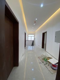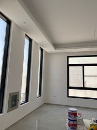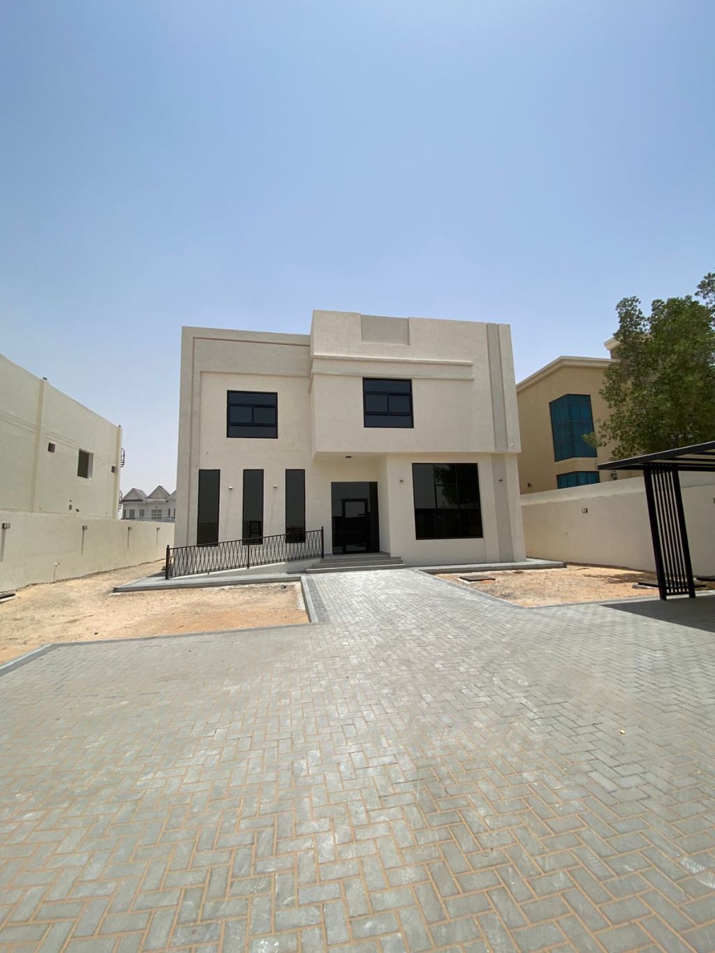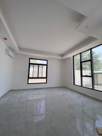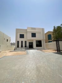 Villa for rent in Sharjah, new Al Tay area, first residence. Split air conditioning. The Villa has two floors. The ground floor consists of two open living rooms with a master bedroom and an indoor kitchen. A maid's room and laundry room are located in the back. The first floor consists of four large master bedrooms. The land area is 10000 square feet. The building area is 6000 square feet. The required