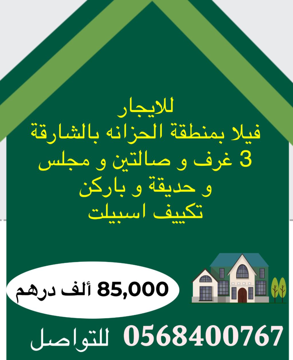 للإيجار فيلا طابقين بمنطقة الحزانة 3 غرف وصالتين ومجلس ب 85000 ألف درهم
