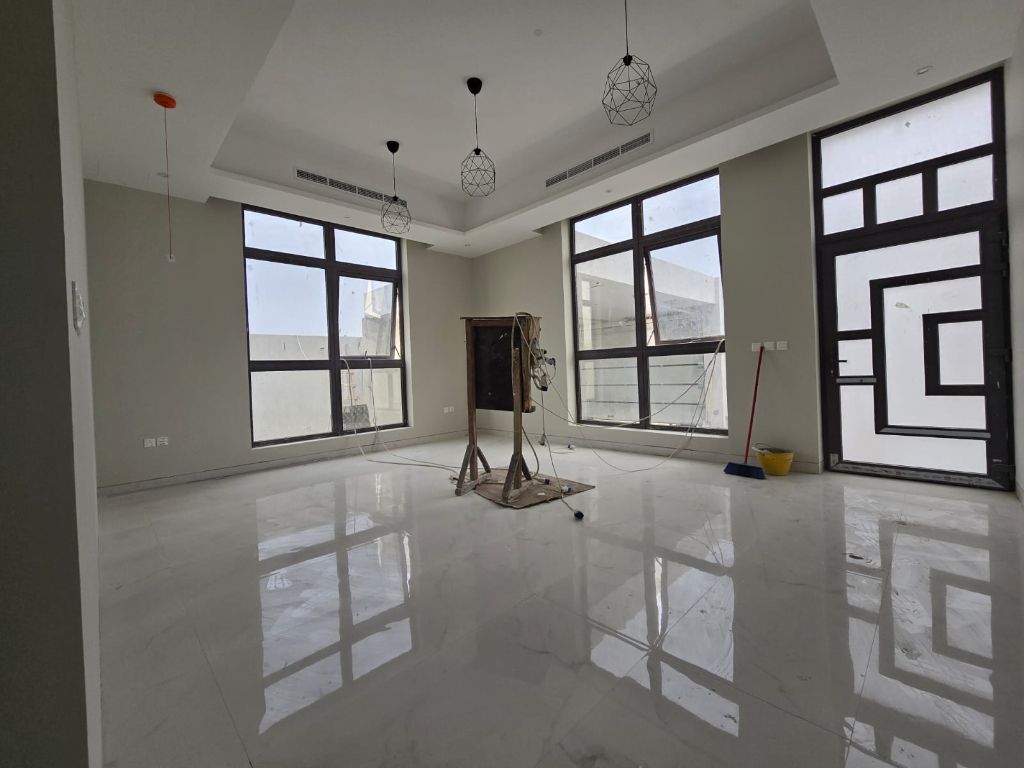 Brand new villa, first tenant, available for annual rent in Hoshi - Sharjah, featuring high - end finishing and premium quality. The Villa is equipped with a full Smart home system, an internal elevator, central air conditioning, and central gas. It offers covered indoor parking with an electronic gate, as well as a spacious outdoor parking area, and a large yard with landscaped flower beds. The ground