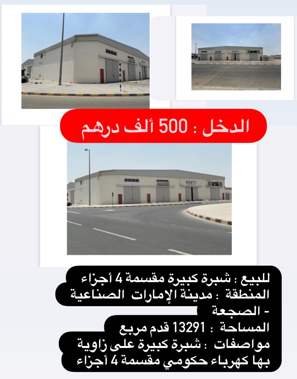 للبيع شبرة كبيرة مقسمة 4 أجزاء المنطقة مدينة الإمارات الصناعية - الصجعة المساحة 13291 قدم مربع مواصفات شبرة كبيرة على زاوية بها كهرباء حكومي مقسمة 4 أجزاء الدخل 500 ألف درهم