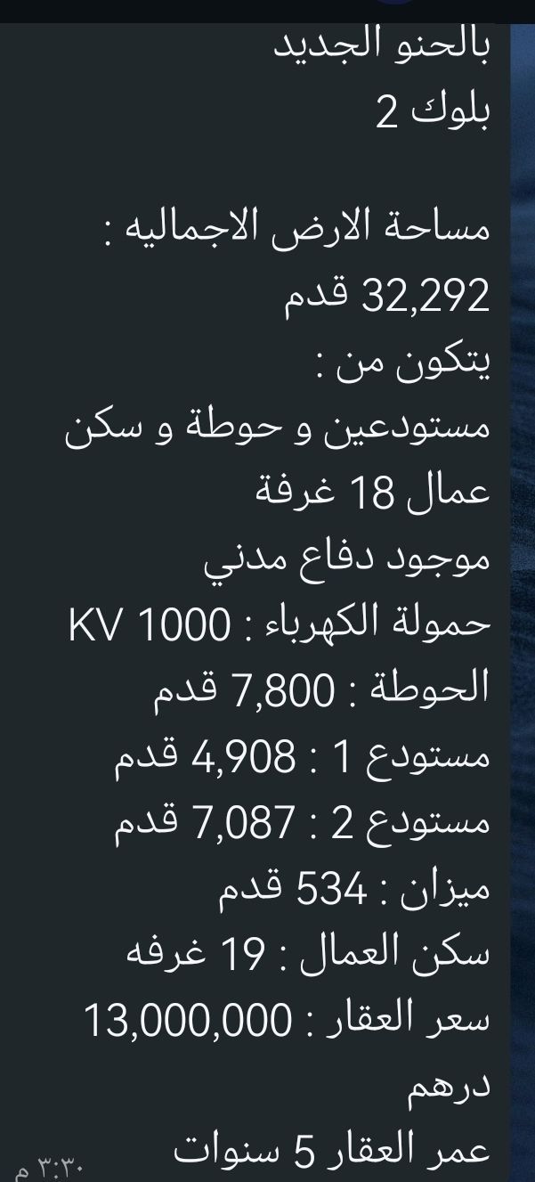بالحنو الجديد بلوك 2 مساحة الأرض الاجماليه 32292 قدم يتكون من مستودعين وحوطة وسكن عمال 18 غرفة موجود دفاع مدني حمولة الكهرباء 1000 KV الحوطة 7800 قدم مستودع 1 4908 قدم مستودع 2 7087 قدم ميزان 534 قدم سكن العمال 19 غرفة سعر العقار 13000000 درهم عمر العقار 5 سنوات مصطفى