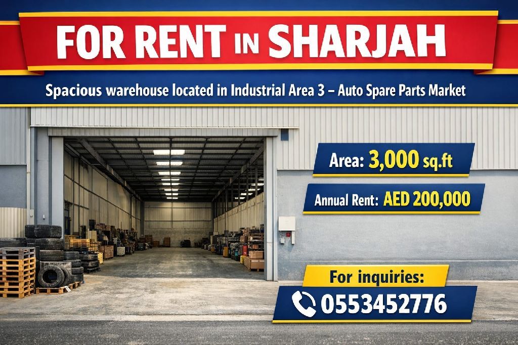 للإيجار في الشارقة مستودع مميز في المنطقة الصناعية الثالثة - سوق قطع غيار السيارات بمساحة 3000 قدم مربع بسعر 200000 درهم سنويا للتواصل