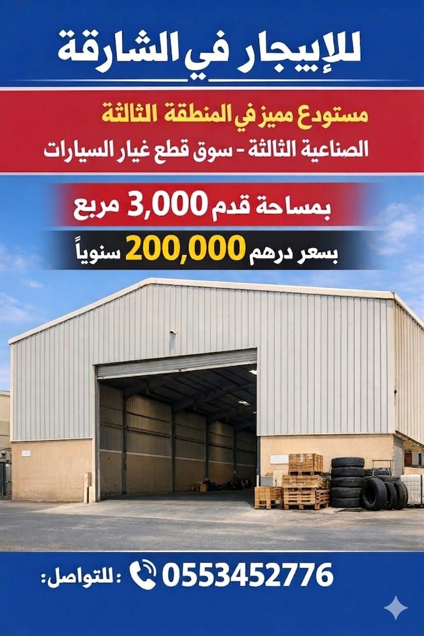 For rent in Sharjah Spacious warehouse located in Industrial Area 3 - Auto Spare Parts Market Area 3000 SqFt Annual rent AED200000 For inquiries