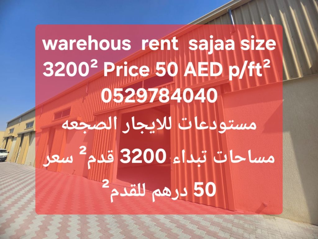 Wear house new for rent in Sajaa Industrial size 3400 ft with electricity and water available price AED50 p ft