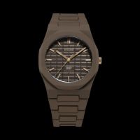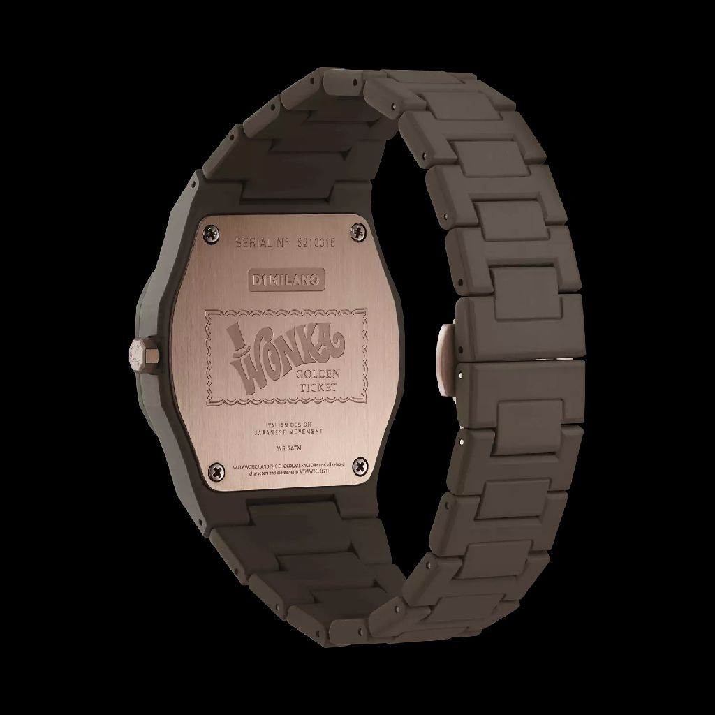 WELCOME TO THE WILLY WONKA AND THE CHOCOLATE FACTORY The Willy Wonka and The Chocolate Factory X D1 Milano collaboration turns our Polycarbon into an irresistible monoblock brown timepiece. Indulge in a monochrome IP Brown creation, carving a full brown dial, golden second hand, and engraved case back CASE SIZE 40,5mm X 8,80mm