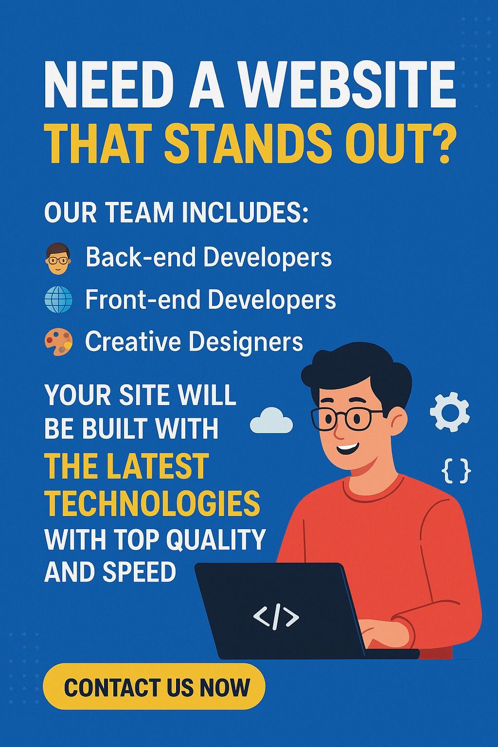 هل تبحث عن موقع ويب احترافي يرفع من قوة علامتك التجارية ويضعك في مقدمة المنافسة نحن فريق برمجي متكامل يضم Back - end Developers بخبرة عالية في بناء أنظمة قوية وآمنة. مصممين مبدعين يحولون الأفكار الى واجهات مستخدم جذابة وسلسة. Front - end Developers لتجربة مستخدم حديثة وسريعة. وباقي الطاقم التقني اللازم لاطلاق موقعك الالكتروني باستخدام أحدث الأدوات والتقنيات العالمية