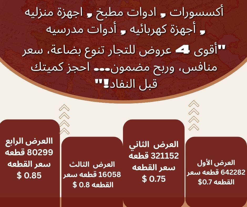 باقات ضخمة تبدأ من 80299 قطعة ملابس وأكسسوارات وكوزمتكس وعطور واداوت مطبخ وكهربائيات وتصل حتى 642282 قطعة بأسعار مذهلة تبدأ من 0.70 دولار فقط للقطعة أسعار تنافسية كميات كبيرة فرصة ذهبية للتجار وأصحاب المحلات يوجد قوائم تفصيلية للمواد مع الصور البضاعة متوفرة للمعاينة مباشرة لا تضيع الفرصة وابدأ تجارتك الآن