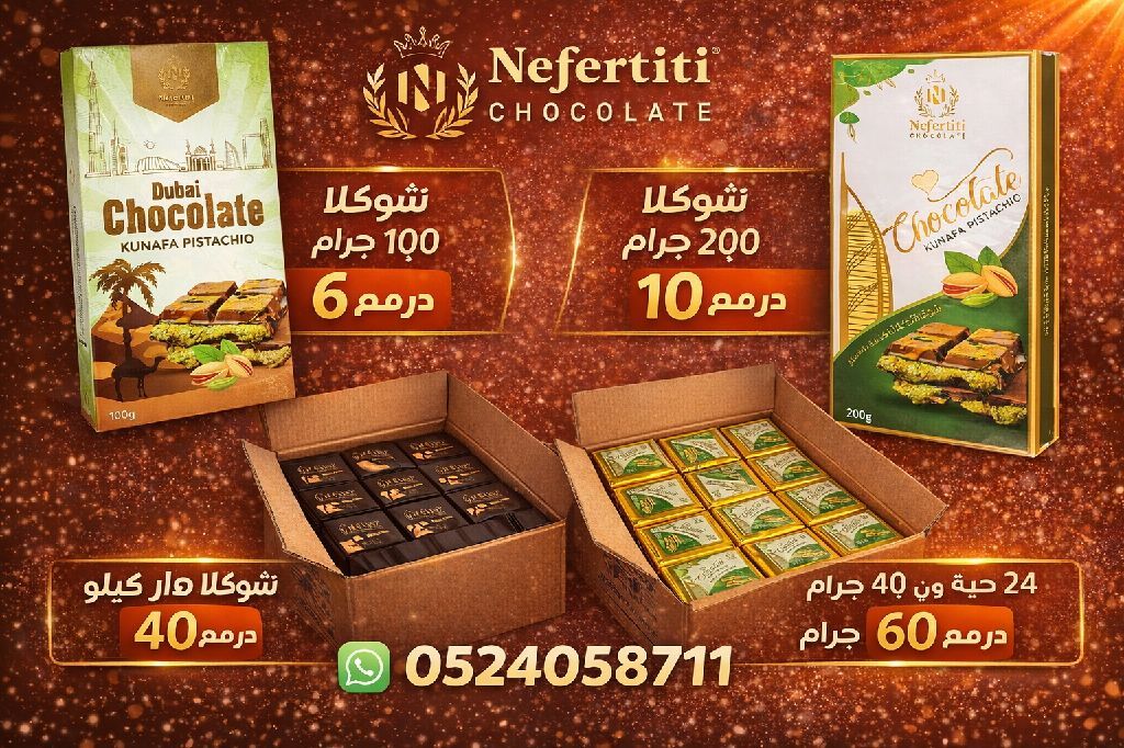 متوفر شوكلا دبي أنوع ممتاز وأسعار مناسبة جدا وأحجام مختلفة يوجد توصيل مجاني على كامل الامارات