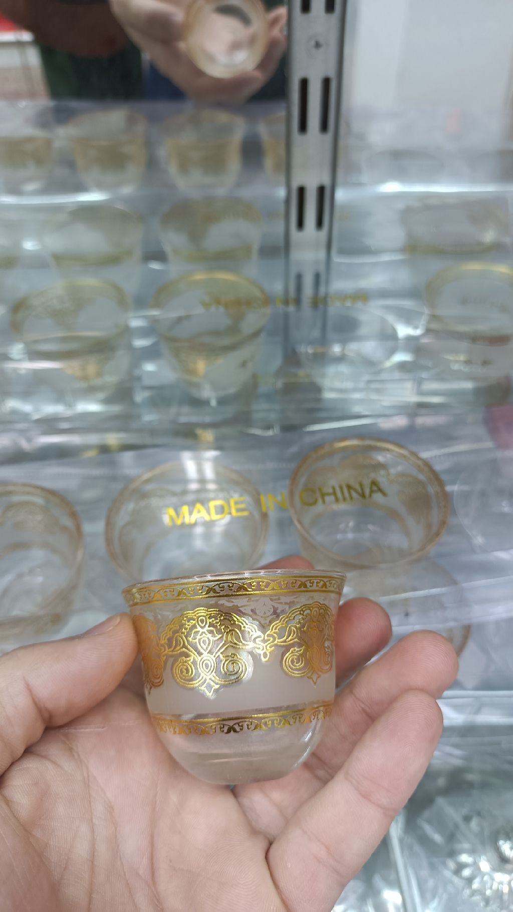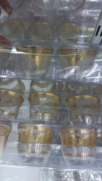 Available Gold - plated glass cups, set of 6 cups per box. Total quantity approximately 1800 sets per box. Price per box/ set 5 dirhams. Wholesale only