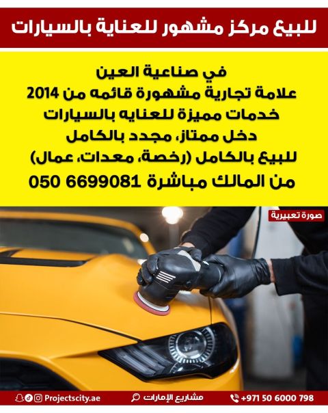 For sale A famous car care center in Senaiya Al Ain A well - known and distinguished brand established since 2014 Distinguished by its unique and exclusive services in the field of Smart car care and repairs in the UAE. Excellent income, fully renewed license and lease. for sale in its entirety (license, equipment, experienced workers) Directly from the owner For contact, call