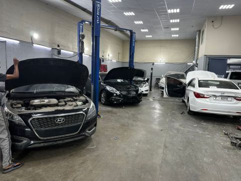For rent a garage in Industrial Area 4 with an area of 200 SQM, fully air - conditioned with a 4 - ceiling height, fully equipped and ready for operation. It includes an air - conditioned management office, a paint room, a bathroom, two jacks, an air compressor, complete mechanical tools, body repair tools, and painting tools. The office has been fully renovated and includes a document cabinet