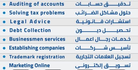 مجموعة خدمات محاسبية وقانونية وضريبة وخدمات رجال الأعمال، محاسبون قانونيون متخصصون في تقديم وتسجيل ضريبة القيمة المضافة وضريبة الشركات وخدمات المحاسبة والمراجعة والتدقيق ودراسات الجدوى وخدمات رجال الأعمال، تسجيل الضرائب وتقديم الاقرارات وانهاء التراكمات المحاسبية والضربيبة والاستشارات القانونية وتحصيل الديون وتسجيل العلامة التجارية والتسويق الالكتروني. للتواصل
