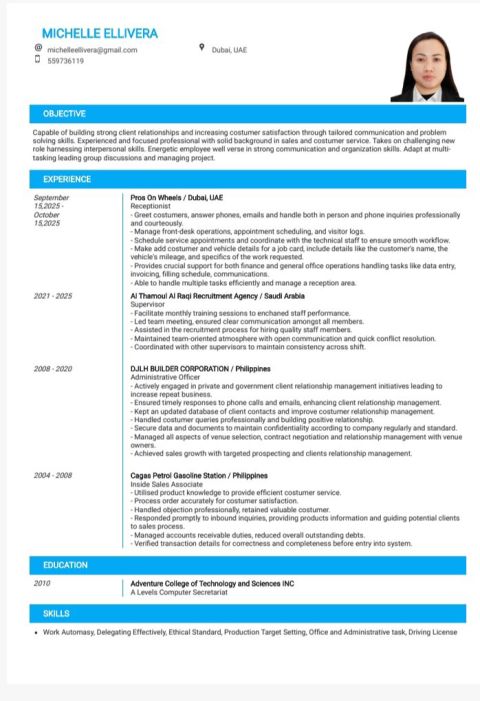 My name is Michelle ellivera I am from Philippine OBJECTIVE capable of building strong client relationship's and increasing costumer satisfaction through teilored communication and problem solving skills experienced and focused professional with solid background in sales and costumer service adapt at multi tasking leading group discussions and managing project. I am looking this job in Dubai