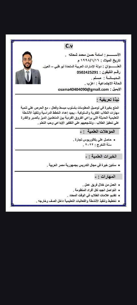 معلم لجميع المراحل وخبرة عامين أتمتع بخبرة في توصيل المعلومات بأسلوب مبسط وفعال، مع الحرص علي تنمية مهارات الطلاب الفكرية والسلوكية، يجيد اعداد الخطط الدراسية وتنفيذ الأنشطة التعليمية الحديثة التي يراعي الفروق الفردية بين المتعلمين أتميز بالصبر والقدرة علي تحفيز الطلاب، وتشجعيهم علي التفكير الابداعي وحب التعلم
