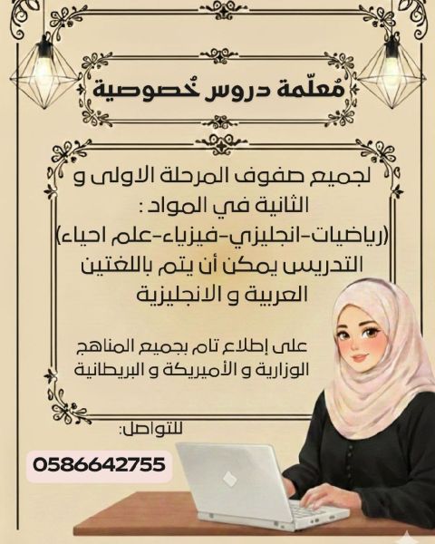 معلمة خبرة في التأسيس والتدريس لجميع المراحل في المنهج الحكومي المنهج البريطاني شراكات المواد English Science Mathematics Arabic Islamic Studies Education أتميز بالصبر وطولة البال وتوصيل المعلومة بأسلوب سلس وسهل الاستيعاب، مع متابعة دقيقة للطالبات والتزام كامل بالمواعيد. متواجدة في جميع مناطق العين شعاب الأشخر وما جاورها للتواصل