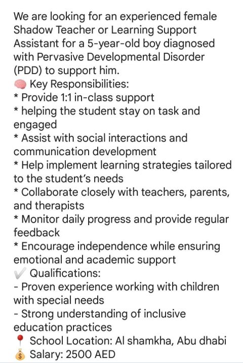 We are looking for an experienced female Shadow Teacher. Key Responsibilities Provide 1:1 in - class support Assist with social interactions and communication development School Location Al Shamkha, Abu Dhabi Salary AED2500 No visa provided