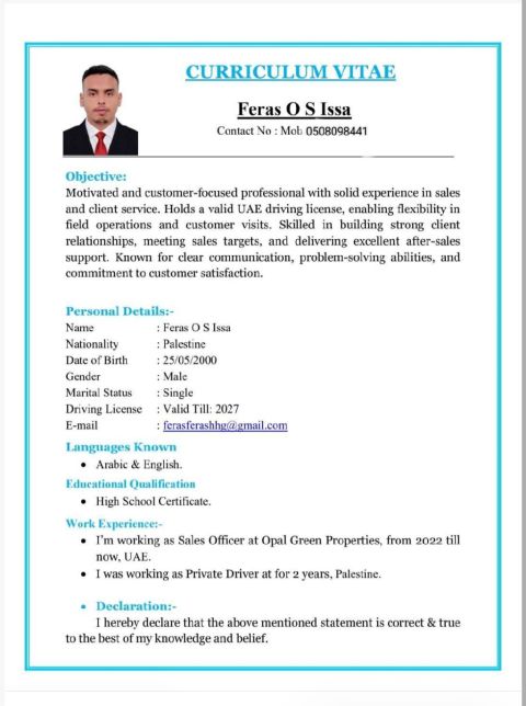 ابحث عن فرصة عمل فلسطيني الجنسية لدي اقامة ورخصة قيادة دبي لدي خبرة في كذا مجال العقارات وتجارت السيارات والبيع والشراء واشتغلت في نادي رياضي لدي خبرة داخل الدولة