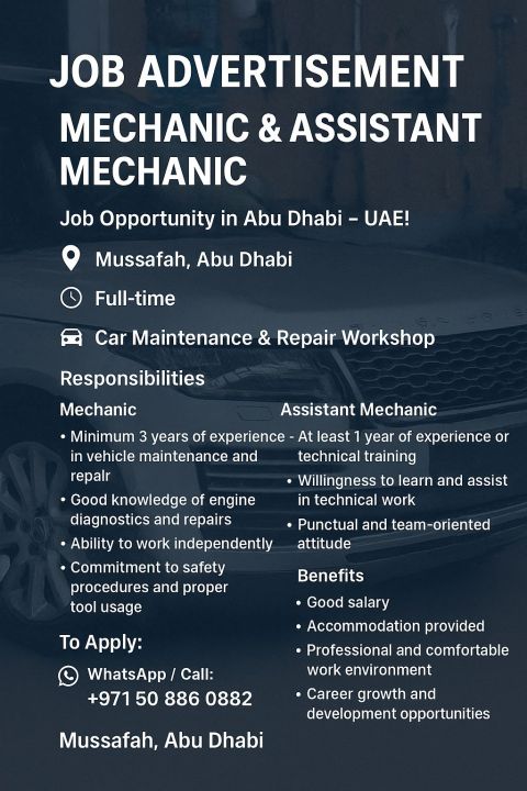 مطلوب ميكانيكي خبرة لشركة تصليح سيارات في منطقة المصفح في أبوظبي يرجى التواصل على الرقم الموجود أو الايميل