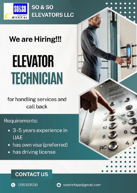 Required for handling services and call back of Elevators, and Elevator Technician in Electra St, Abu Dhabi, Must have 3 to 5 years experience in UAE, has own visa (preferred) has a valid UAE driving license. Send your CV with job title in subject line