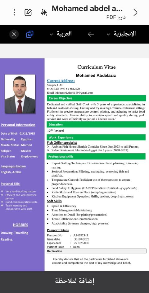 أنا أحمد شيف جزار سمك خبرة في البلد وشيف قلايه ومعي اقامة قابلة للإعارة