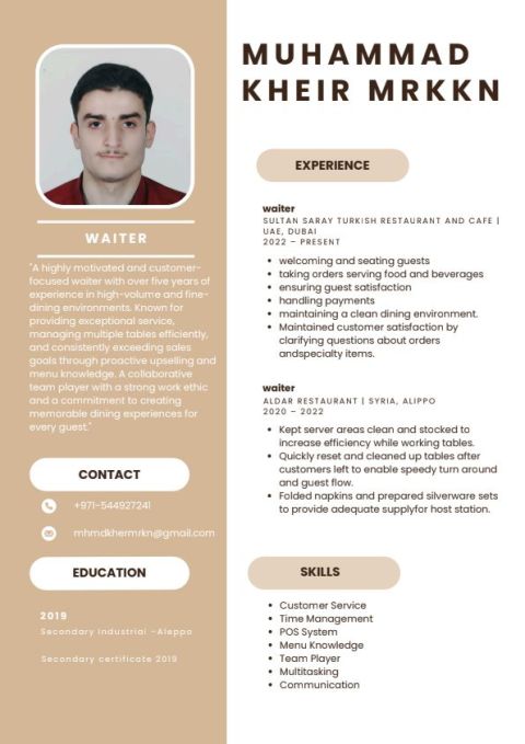 أنا ابحث عن عمل وايتر في مطعم لدي خبرة في هذا المجال لأربع سنوات في دبي