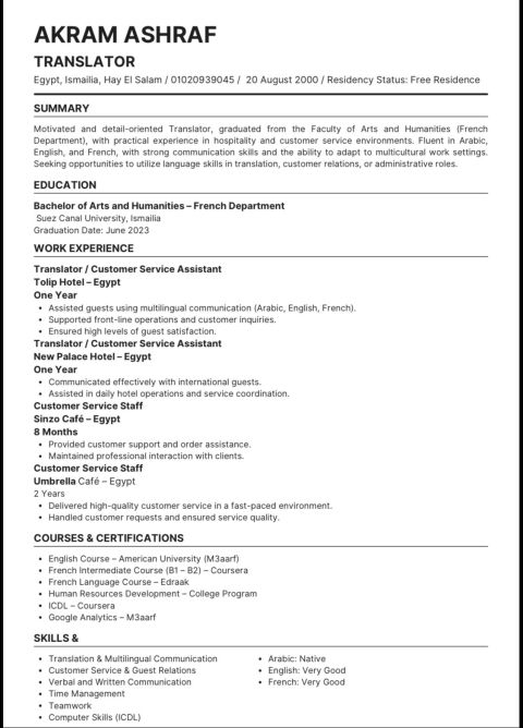 باحث عن وظيفة كاشير لدي خبرة في مجال الكاشير والتعامل مع العملاء، وتشغيل أنظمة الكاشير، وتحصيل المدفوعات ومراجعة الحسابات اليومية. كما امتلك خبرة في الأعمال السكرتارية مثل تنظيم الملفات، تنسيق المواعيد، والتعامل مع المكالمات. أتميز بالدقة، الالتزام، حسن التعامل، والقدرة على العمل تحت ضغط وضمن فريق. جاهز للعمل فورا