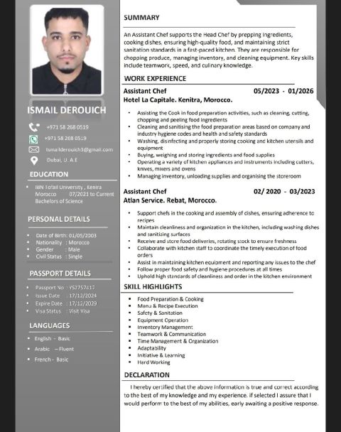 Dear Hiring Managers, My name is Ismail, and I am currently in Dubai actively seeking a new opportunity in the restaurant and hospitality industry. I bring 3 years of hands - on experience, including 1 year in hotels and 2 years in fast - paced fast - food restaurants. Through my experience, I have developed strong skills in customer service, teamwork, order handling, and working efficiently under