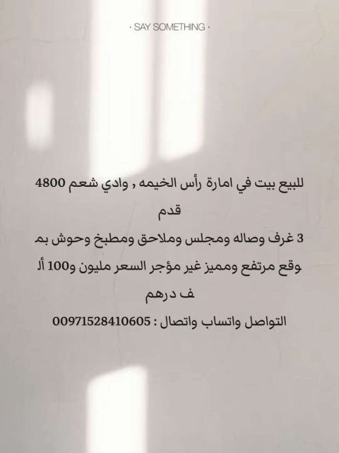 للبيع بيت في إمارة رأس الخيمة وادي شعم 4800 قدم بسعر مليون و100 ألف درهم