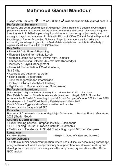 Professional Accountant with a Bachelor’s degree in Accounting and hands - on experience in financial accounting, payroll, HR operations, and supplier accounts. Skilled in preparing payroll reports, monitoring attendance, verifying invoices, and generating accurate financial reports. Detail - oriented, reliable, and able to work under pressure. Based in the UAE and available for immediate joining