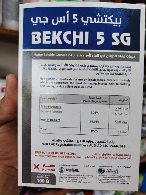 Goodbye to cropworms Do you have cotton paper worm or fruit worms in tomatoes and peppers Powerful and tried - and - true solution arrived Bekchi 5 SG Active Ingredient Imamectin Benzoate 5.26%. Eliminate worms immediately (by contact and by stomach) Safe and effective on vegetables and fruit trees. Now available in - store