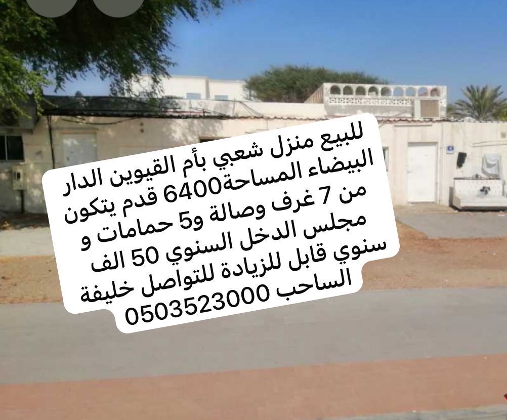 للبيع منزل شعبي في أم القيوين الدار البيضاء المساحة 6400 قدم يتكون من 7 غرف وصالة و5 حمامات ومجلس الدخل السنوي 50 ألف سنوي قابل للزيادة للتواصل خليفة الساحب