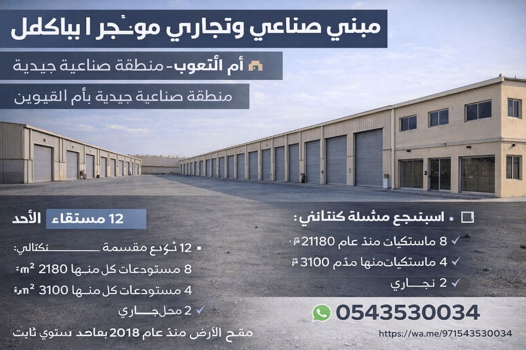 للبيع - مجمع مستودعات ومحلات تجارية في ام الثعوب الصناعية - أم القيوين فرصة استثمارية مميزة للمستثمرين وأصحاب الشركات الباحثين عن عقار صناعي جاهز بعائد استثماري مستقر في واحدة من المناطق الصناعية الواعدة في إمارة ام القيوين. يقع هذا المجمع في منطقة ام الثعوب الصناعية الجديدة التي تشهد نموا متسارعا في الأنشطة الصناعية والتجارية، وتتميز بسهولة الوصول الى الطرق الرئيسية التي تربط الامارة ببقية امارات