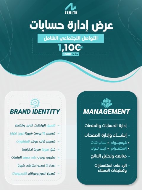 انطلق بعلامتك التجارية مع Zenith نقدم لك باقة الإدارة الشاملة ب 1100 درهم فقط إدارة الحسابات فيسبوك، انستغرام، تيك توك، سناب) الهوية البصرية تصميم 15 بوست + فيديو احترافي + ستوري يومي كتابة المحتوى محتوى ابداعي وجدولة ذكية. اعلانات ممولة إدارة حملات احترافية وتقارير أداء شهرية. اجعل القمة مجرد البداية للتواصل