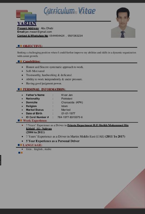 My name is izhar Muhammad I am from Pakistan living in Abu Dhabi I have light vehicle license and I have also 6 years driving experience in UAE (1) 3 years experience as a transport supervisor with food nation catering in Abu Dhabi. 2) two years experience as a purchaser with andaleeb contracting l c in Abu Dhabi (3) one year experience as a private driver with Chinese family in Dubai