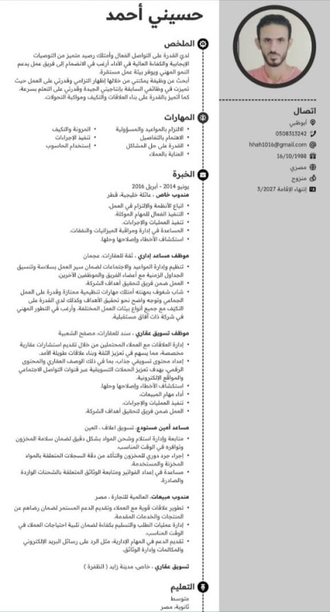 أنا حسيني مصري مقيم انتهاء الإقامة 3 / 2027 ابحث عن عمل مناسب، متعلم، سبق لي العمل كمندوب خاص بالخليج وأيضا اشتغلت في الامارات ك أمين مخازن وفورمان وفي التسويق العقاري والمبيعات لدي القدرة والامكانية من تطوير نفسي والتعلم من مجالات العمل السابقة أجيد الالتزام بالعمل وتنفيذ المهام المكلفه لي وتحمل ضغوط العمل والعمل الجماعي واستخدام الحاسوب بشكل جيد