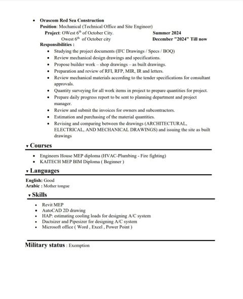مهندس ميكانيكا خبرة لثلاث سنوات ونصف. على دراية بكافة أعمال الموقع من تكييف وأعمال الحريق والصحي وحاصل على العديد من الكورسات في مجال الأمن والسلامة. أسعى دائما لاكتساب الخبرة، وتطوير ذاتي، واثبات كفاءتي، والاستفادة من خبرتي ومهاراتي في التواصل وحل المشكلات
